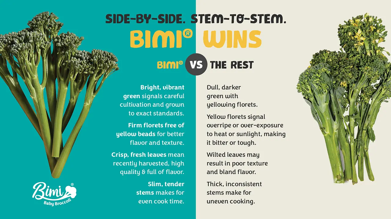 Bring the Superior Stem to your menu with Bimi® Baby Broccoli. With its tender-crisp texture, vibrant color, and naturally sweet flavor, Bimi® doesn’t just perform beautifully in the kitchen — it instantly elevates plate presentation. It’s the kind of ingredient that makes a dish more premium, on-trend and memorable.